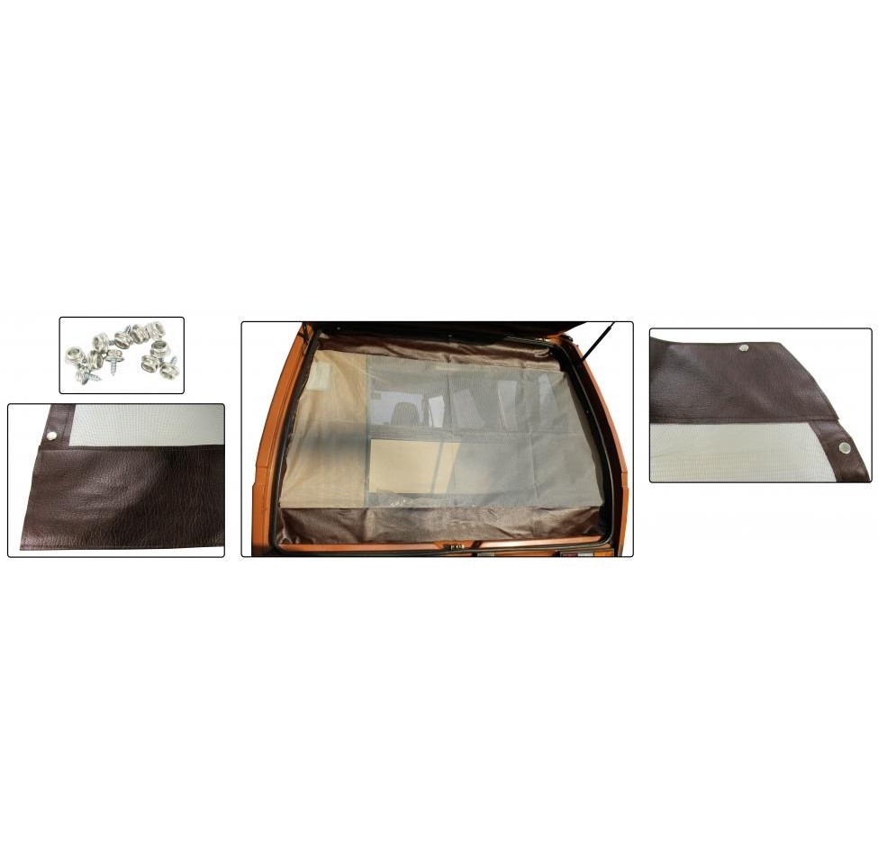 Dieses Insektenschutzgitter wird mit Druckknöpfen befestigt, wobei die mitgelieferten Druckknopf-Grundelemente mit mitgelieferten selbstschneidenden Schrauben an der Innenseite des Aufbaus verschraubt werden (Vorbohren ist erforderlich). Nach der Montage kann die Heckklappe geschlossen werden, ohne das Netz zu entfernen. Sie haben die Wahl zwischen einem festen Schutzgitter (bei dem Sie die Druckknöpfe lösen müssen, um Zugang zu erhalten) oder einem Netz mit einem Reißverschluss in der Mitte (für einen schnellen Zugriff, ohne die Druckknöpfe zu öffnen).